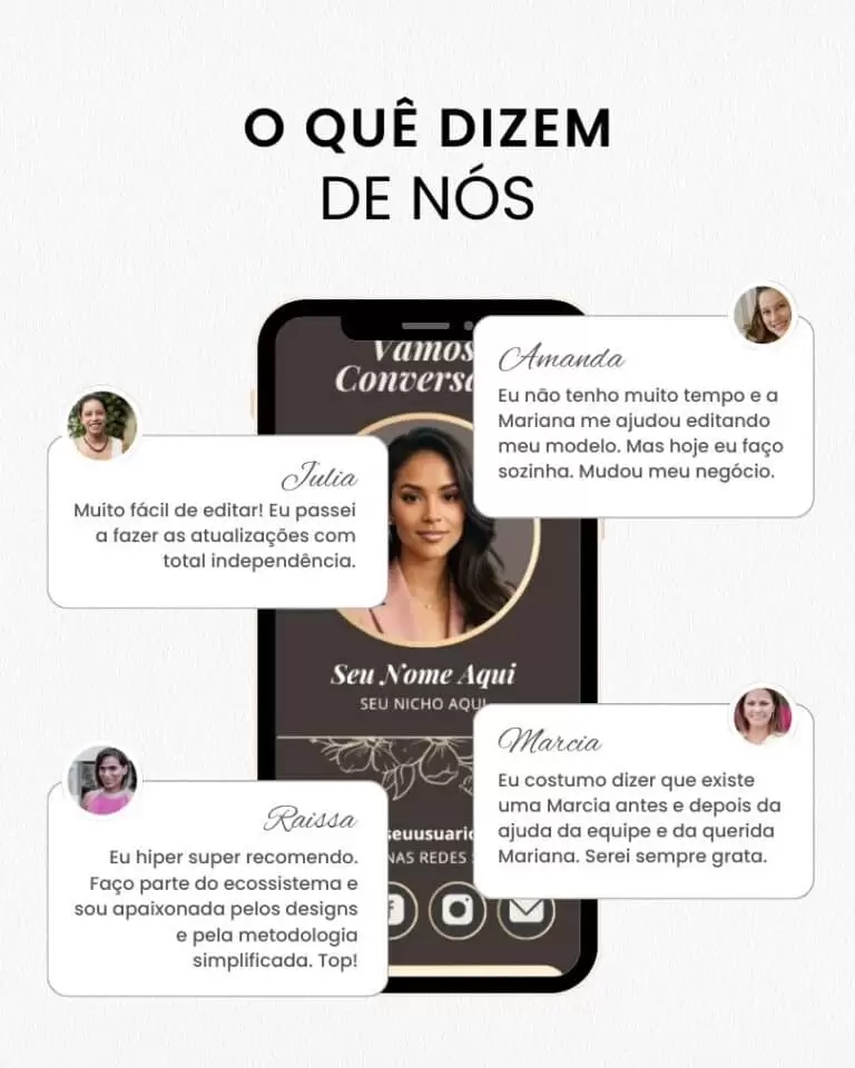 - Fácil personalização de textos, imagens, vídeos e depoimentos