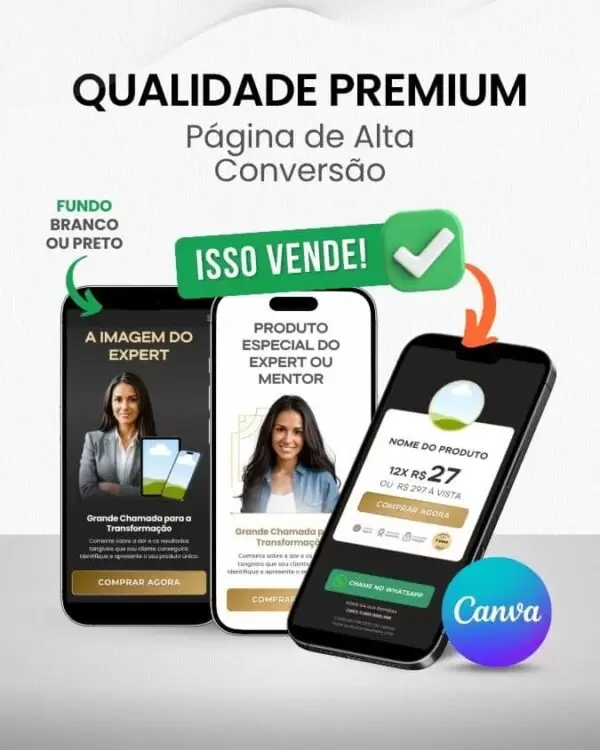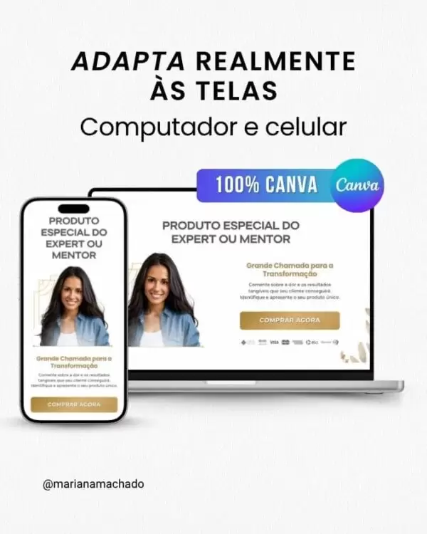 R: Embora seja otimizada para mentores e coaches, seu design sofisticado e funcional, aliado à flexibilidade do Canva, permite que você a adapte para vender outros produtos digitais de alto valor, como cursos online premium, consultorias exclusivas ou programas de acompanhamento. Ela é ideal para qualquer oferta que precise transmitir profissionalismo e transformar.